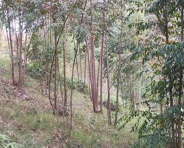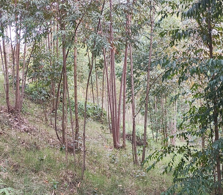 Nous privilégions des essences utiles et bien positionnées : Grevillea robusta (brise-vent, bois d’usage, faible concurrence) et inturusu (Eucalyptus, en bordure dédiée) pour la production de piquets/énergie et la stabilisation des talus. L’implantation se fait en haies sur lignes de niveau, bosquets en tête de pente et bandes tampons en bas de parcelle, avec élagage/éclaircie maîtrisés et paillage au pied pour conserver l’humidité.
